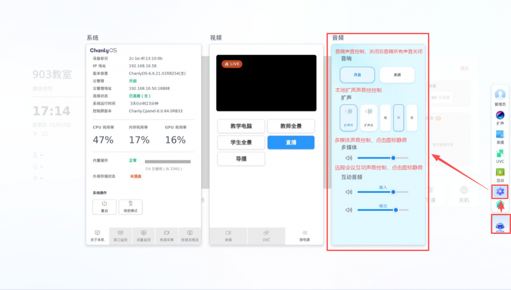 - 点击主控界面中下方位置,点击对应信号源切换画面,点击【直播】切换到直播画面