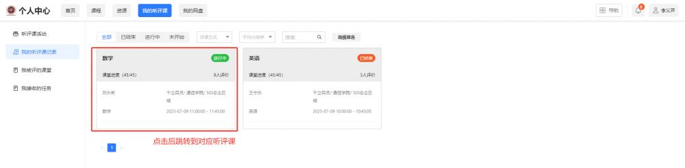 : | ::展示该账号评价过的课程,点击卡片后可跳转到对应听评课 | ||