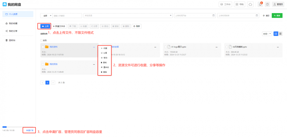 - 点击申请扩容,管理员同意后扩容网盘存储
