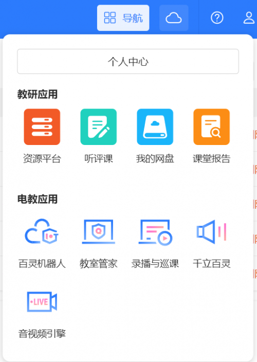 导航:快速进入各应用,听评课前台、资源中心前台、电教各应用前台