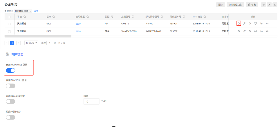 在设备列表中找到需 web 登录的设备,点击操作栏中的“ ” 进入设备管理页面。下拉防护攻击中打开【启用 WAN WEB 登录】开关并保存。