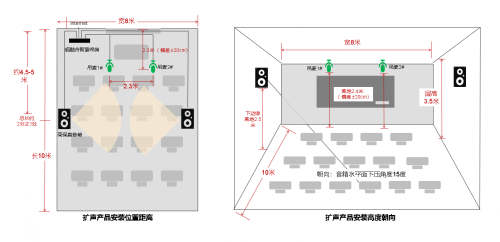 <90㎡方案(2支吊麦+1对音箱): | <90㎡方案(2支吊麦+1对音箱): | ||