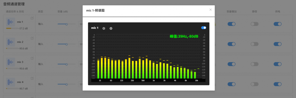 开启频谱图开关并点击打开频谱图,观察说话时频谱图是否波动。(若存在波动则继续下一步测试,如无波动则更换麦克风和麦克风连接线测试);