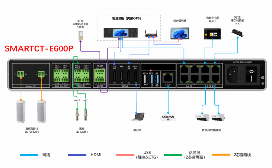 SMARTCT-E600P终端支持通过OTG out与电脑连接,为电脑上安装的腾讯会议等互动软件提供教室内的吊装麦克风、摄像头画面等多种音视频服务。