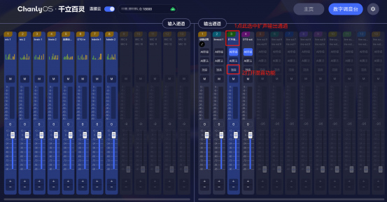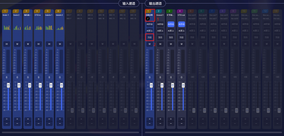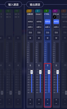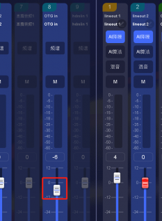 进入【数字调音台】,调整【OTG out】及对应输入通道音量,主推子音量建议区间5-11