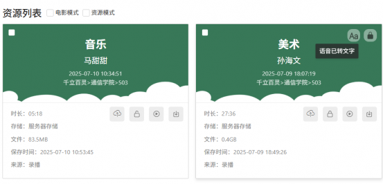 开启语音转文字后,联动课表最后一节课结束,开始转写,课程资源管理列表可查看所录制好的视频显示语音已转文字标签,可播放预览,和下载(批量下载)文件。